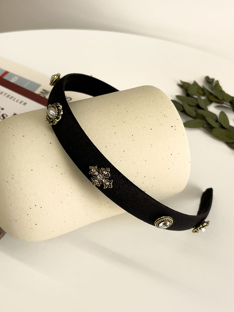 국내제작 엔틱 오브제 큐빅 블랙 골지 헤어밴드 머리띠