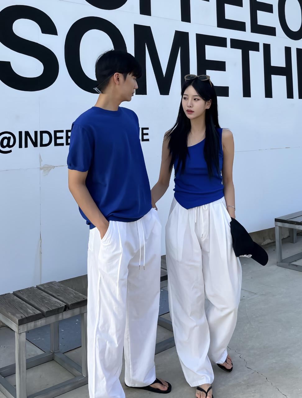 오션 블루 사선 골지 나시 린넨 라운드 니트 제주도 휴가룩 기획 커플 시밀러룩