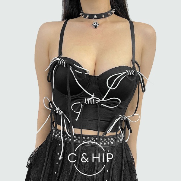 걸코어 리본 로프 섹시 무대의상 방송댄스복 뷔스티에 나시 크롭탑 (화이트/블랙)