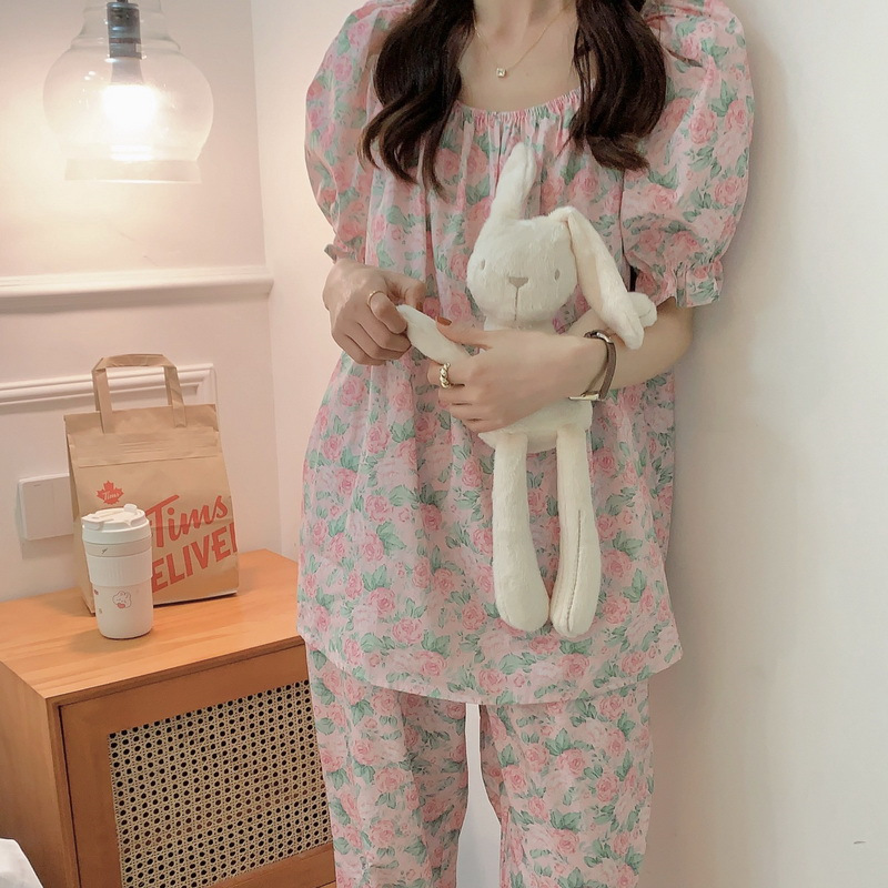 플라워 장미 잠옷 반팔 긴바지 여성 공주 빅사이즈 여름 임산부 요루면 파자마 투피스 세트