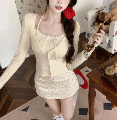 옐로우 페이크 투피스(나시탑+가디건)+미니스커트 투피스 세트
