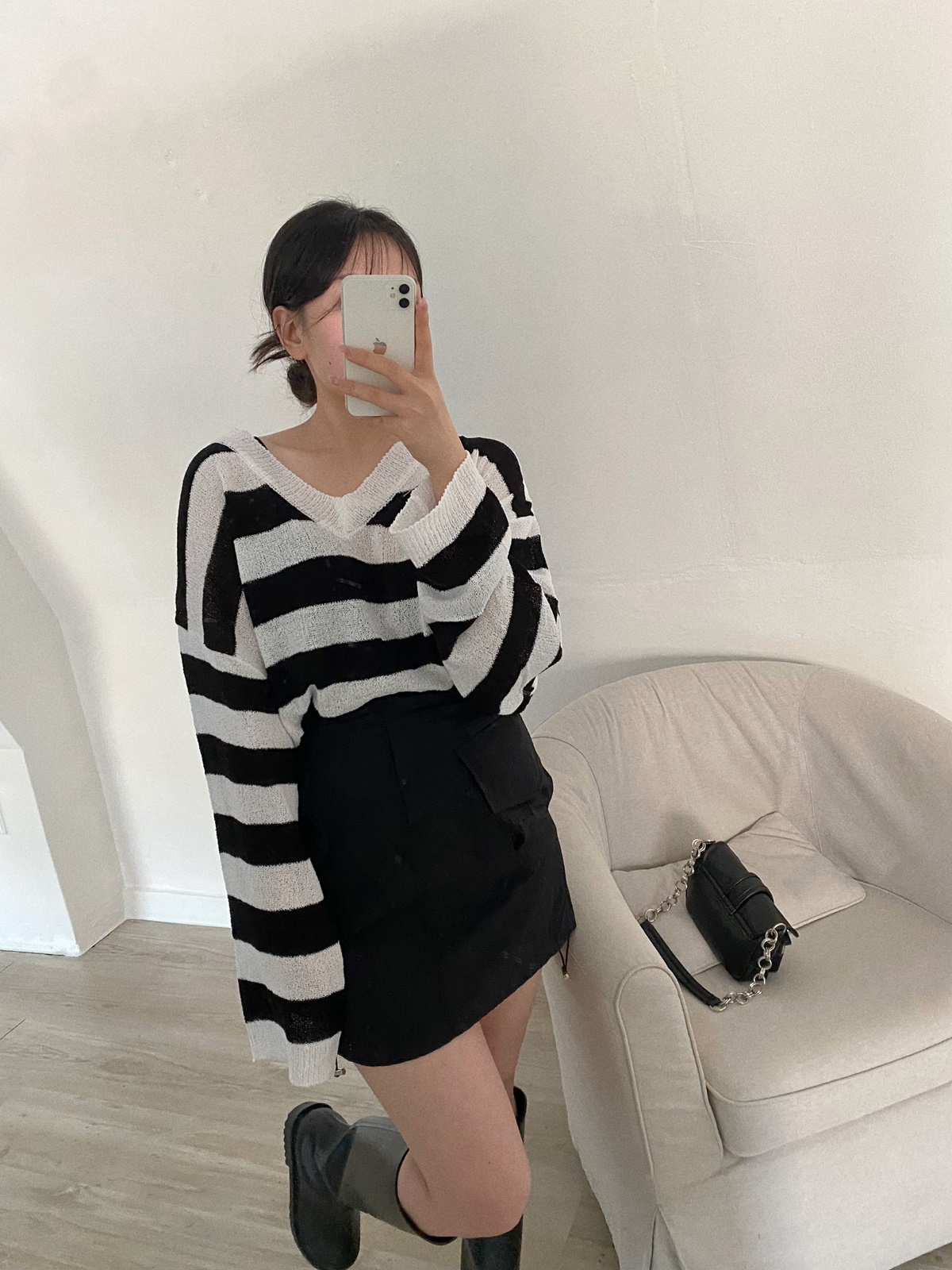 [살안타템💙/44-110] 오버 부클 썸머 단가라 브이넥 니트 (2colors) / ( 빅사이즈 여름 니트 여름 긴팔 니트 씨스루 니트 오버핏 니트 브이넥 장마룩 장마철 레인부츠