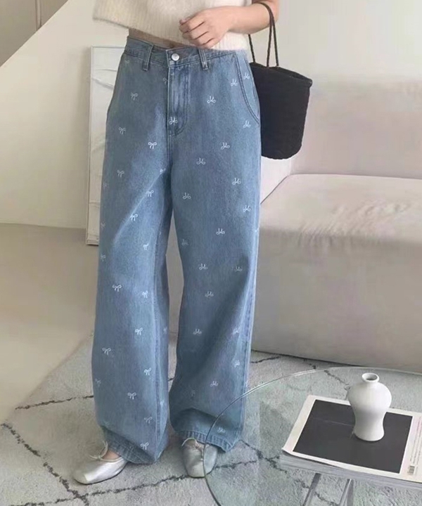 [여름신상💙/고퀄데님]플럼피 리본하트 프린팅 와이드 데님 팬츠(2col)