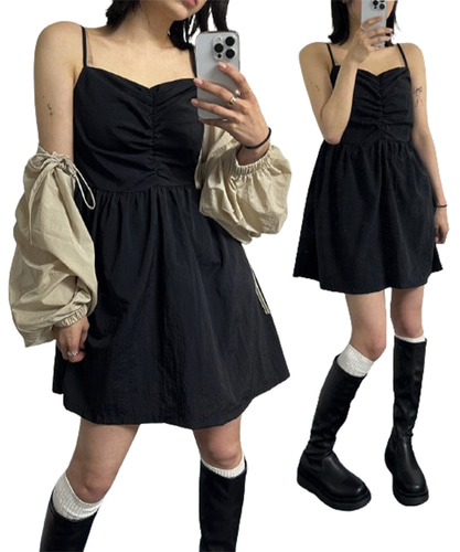 [바캉스룩/레이어드] 나일론 바스락 셔링 나시 미니 원피스 (3col)