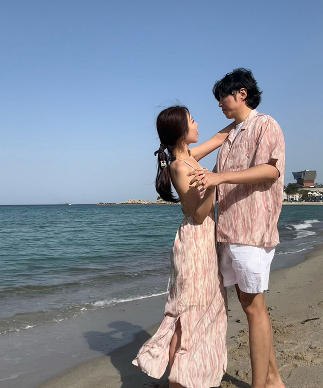 [당일출고/커플인생샷/사장추천!!] 여리 피앙 백오픈 엑스 꼬임 허리 밴딩 롱 트임 원피스 여름 남자 반팔 셔츠 세트
