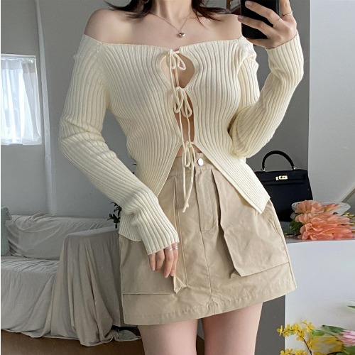 스퀘어넥 리본 긴팔 골지 오프숄더 니트