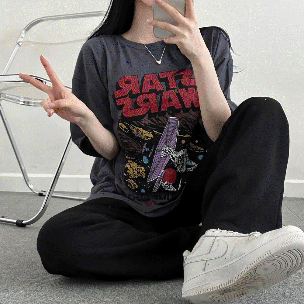 오버핏 캐주얼 라운드 스타워즈 레터링 프린팅 반팔티셔츠