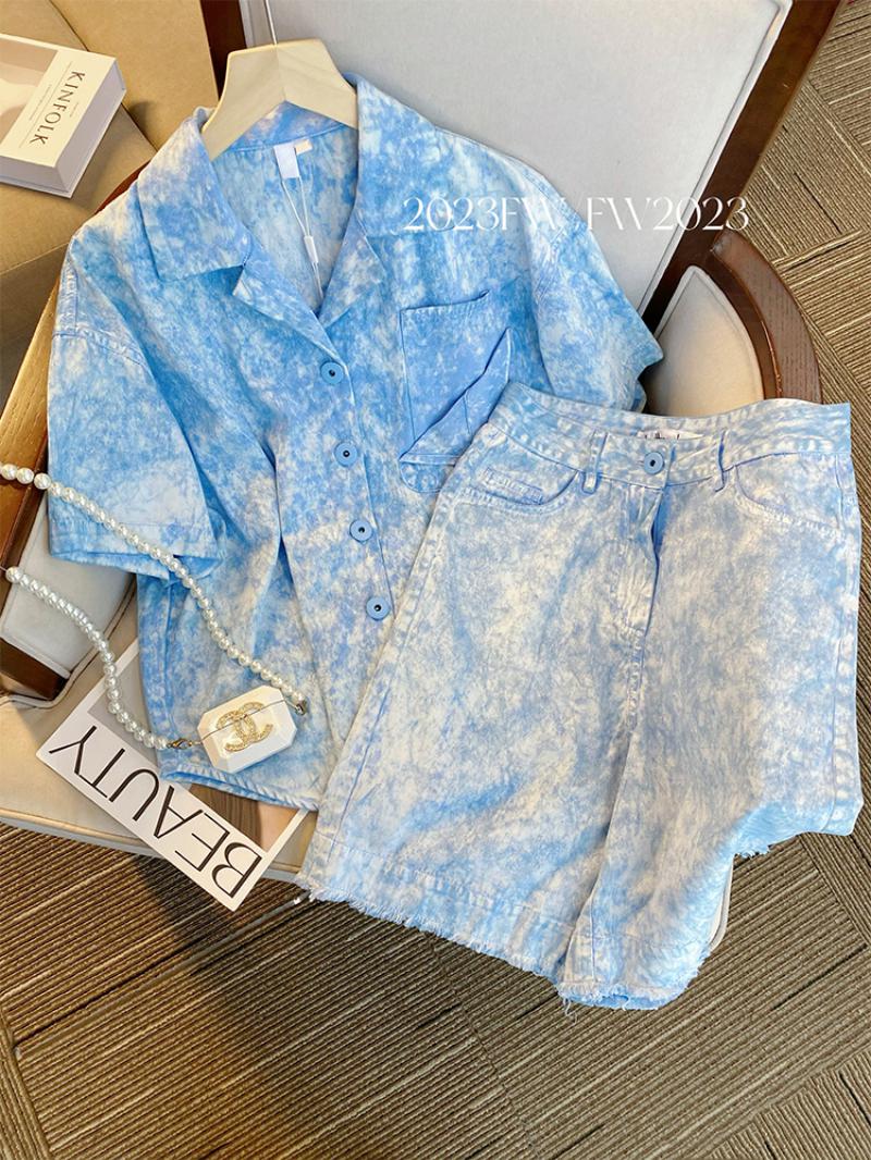 데님 프린트 하늘색 셔츠 버뮤다 반바지 여름 투피스 세트 여성 코디세트 77사이즈