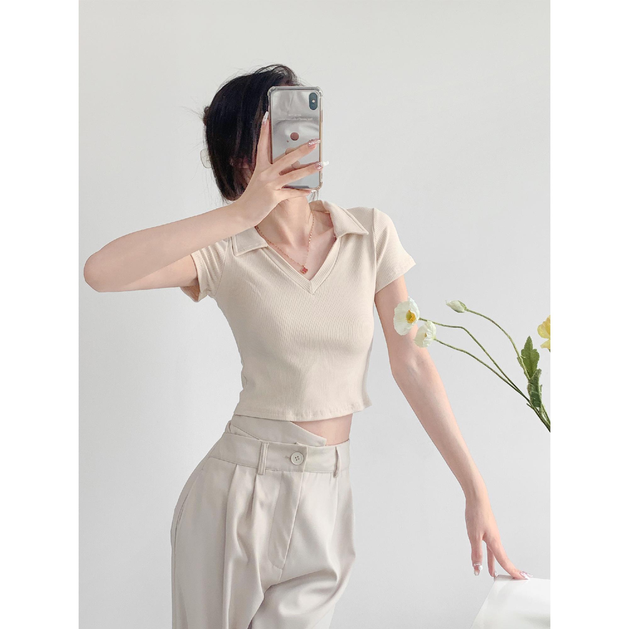 폴로 카라 크롭 반팔 니트 티셔츠 슬림 숏 흰티
