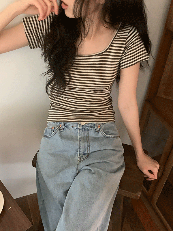 [슬림쫀쫀/팔뚝예뻐보임] 마일라 스트라이프 단가라 유넥 반팔 티셔츠