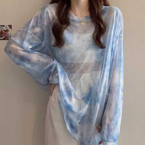 스카이 블루 타이 염색 스타일 시스루 여성 긴팔 티셔츠 J03