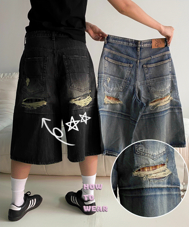 [ 하우투웨어 단독특가/ 주문량 폭주(재고 소량 남음 소진시 품절)/ 흑청 딱 1장 당일출고]빈티지 체크 데미지 버뮤다팬츠(2c)