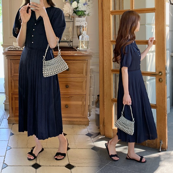 [MADE] 클렘 오픈카라 플리츠 퍼프 반팔 롱원피스(44~99) (빅사이즈원피스-플리츠원피스-퍼프원피스-여름하객룩-여름원피스-반팔원피스-여름하객원피스-하객룩-데이트룩-격식룩-데일리룩)