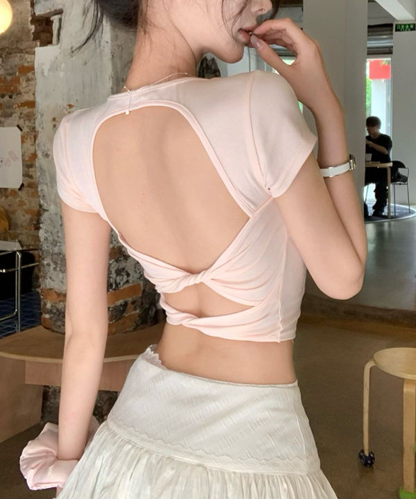 *오늘출발 / 서머 시즌오프 세일 (핑크)* ☆캡 내장☆ 스퀘어넥 백리스 백오픈 꼬임 슬림 착붙핏 크롭 숏 단색 파스텔 섹시 반팔 티셔츠/ 핫한 얇은 부들부들 썸머 축제 페스티발 면티 여름티