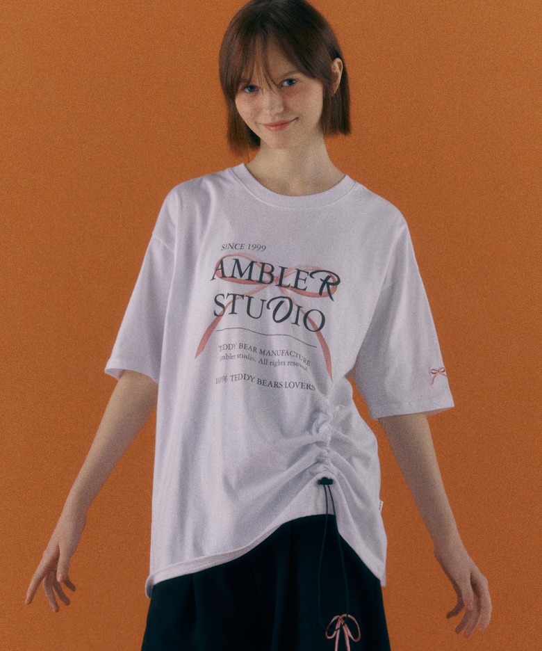 엠블러 남여공용 Bear lovers 오버핏 스트링 반팔 티셔츠 AS1119 (화이트)