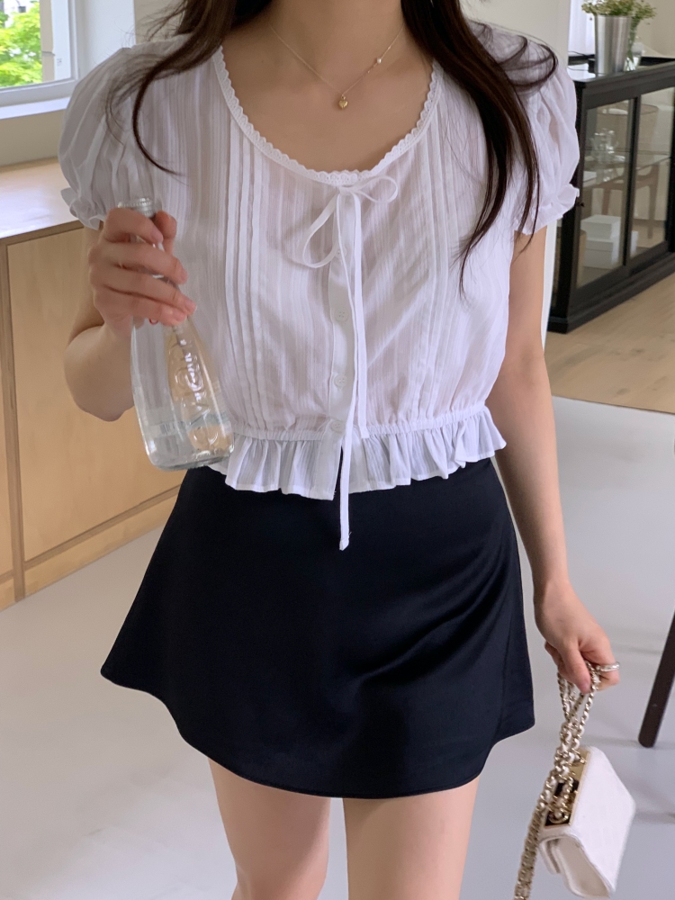 miel 미엘 피오나 리본 프릴 핀턱 레이스 퍼프 숏 크롭 반팔 블라우스 3color