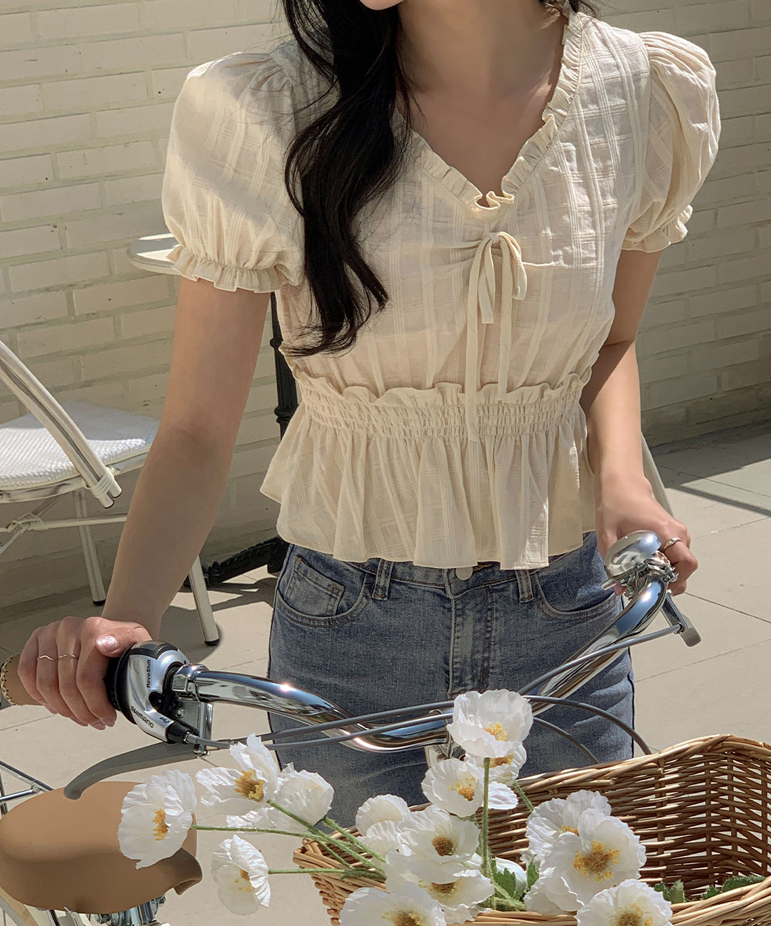 [자체제작/1만장돌파!/뉴컬러추가!/S-XL]르소 프릴 퍼프 반팔 블라우스 (데이트룩/여름블라우스/프릴블라우스/반팔블라우스/퍼프블라우스/브이넥블라우스)