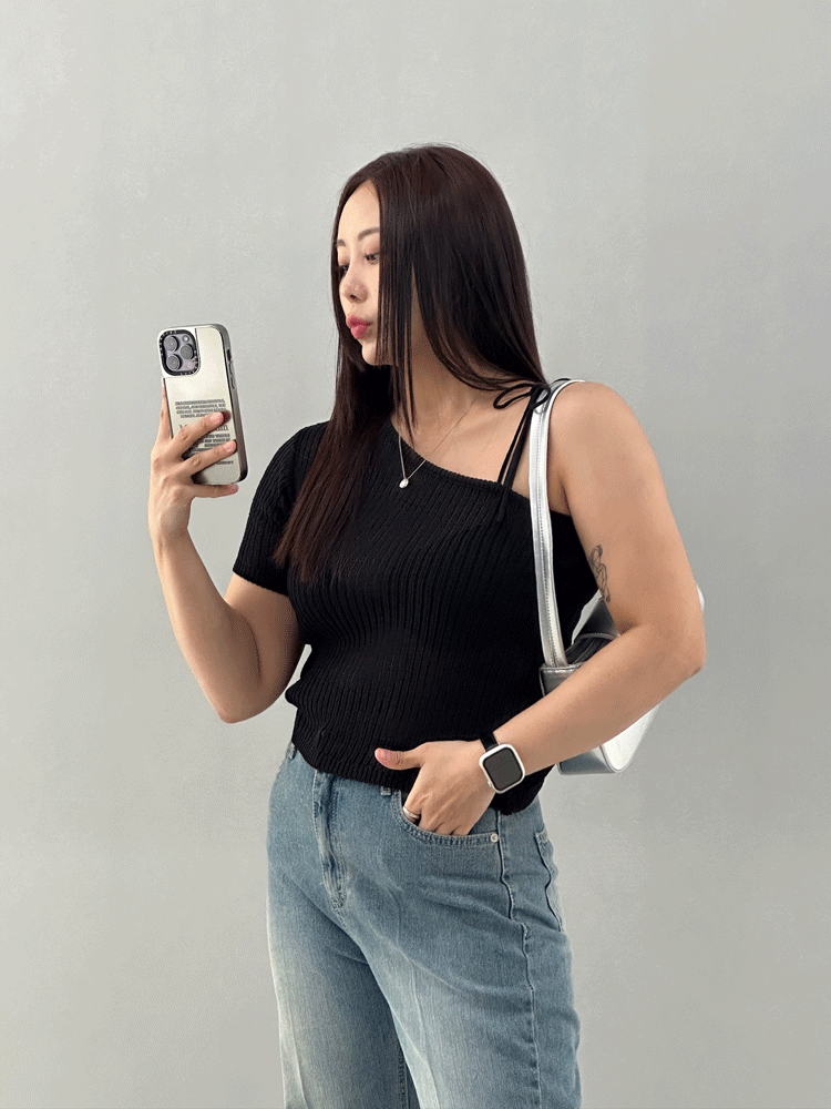 1182 레시 리본 언발 오프숄더 반팔 니트[3color/44-77]