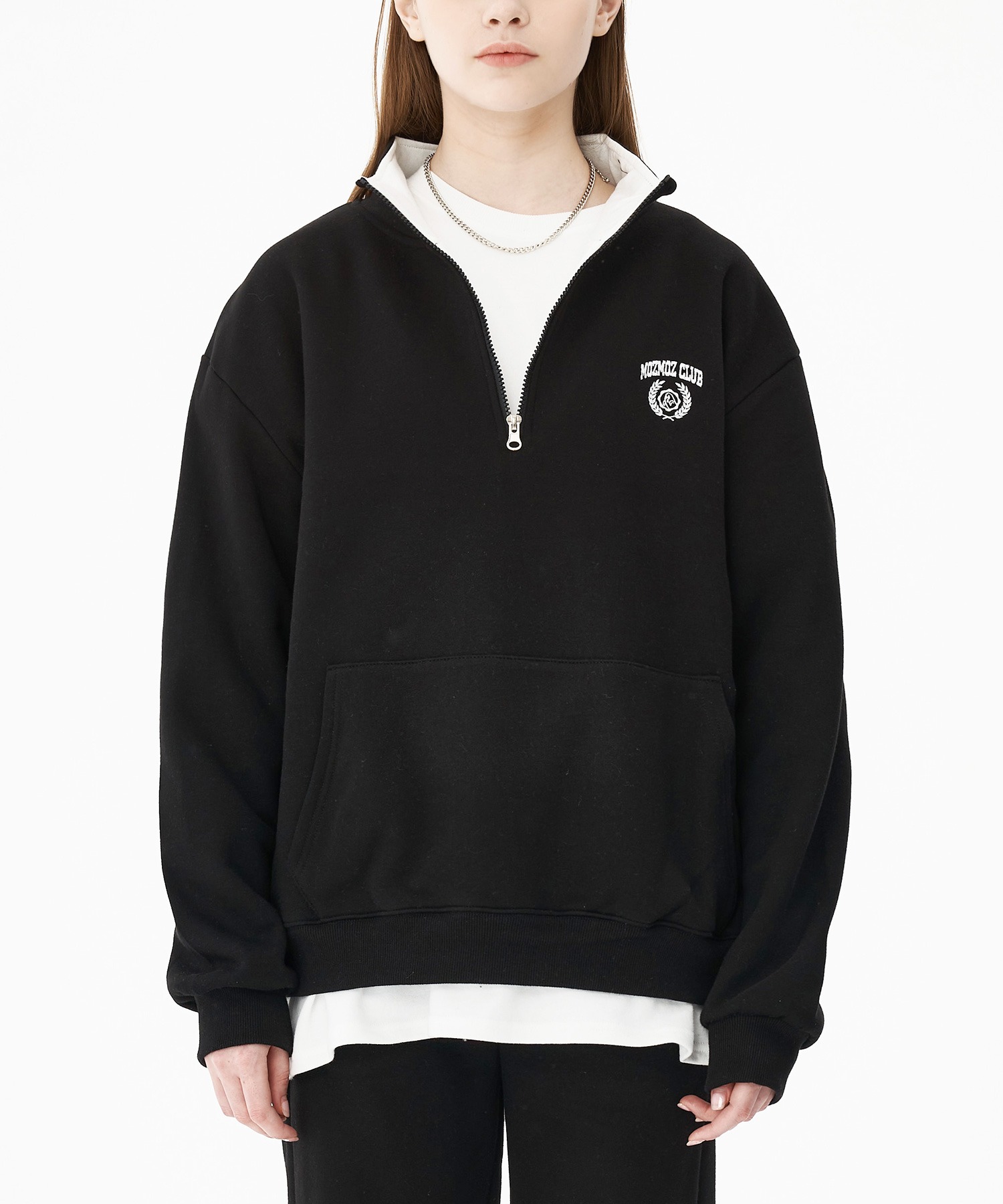 모즈모즈 로럴 오버핏 기모 반집업 블랙