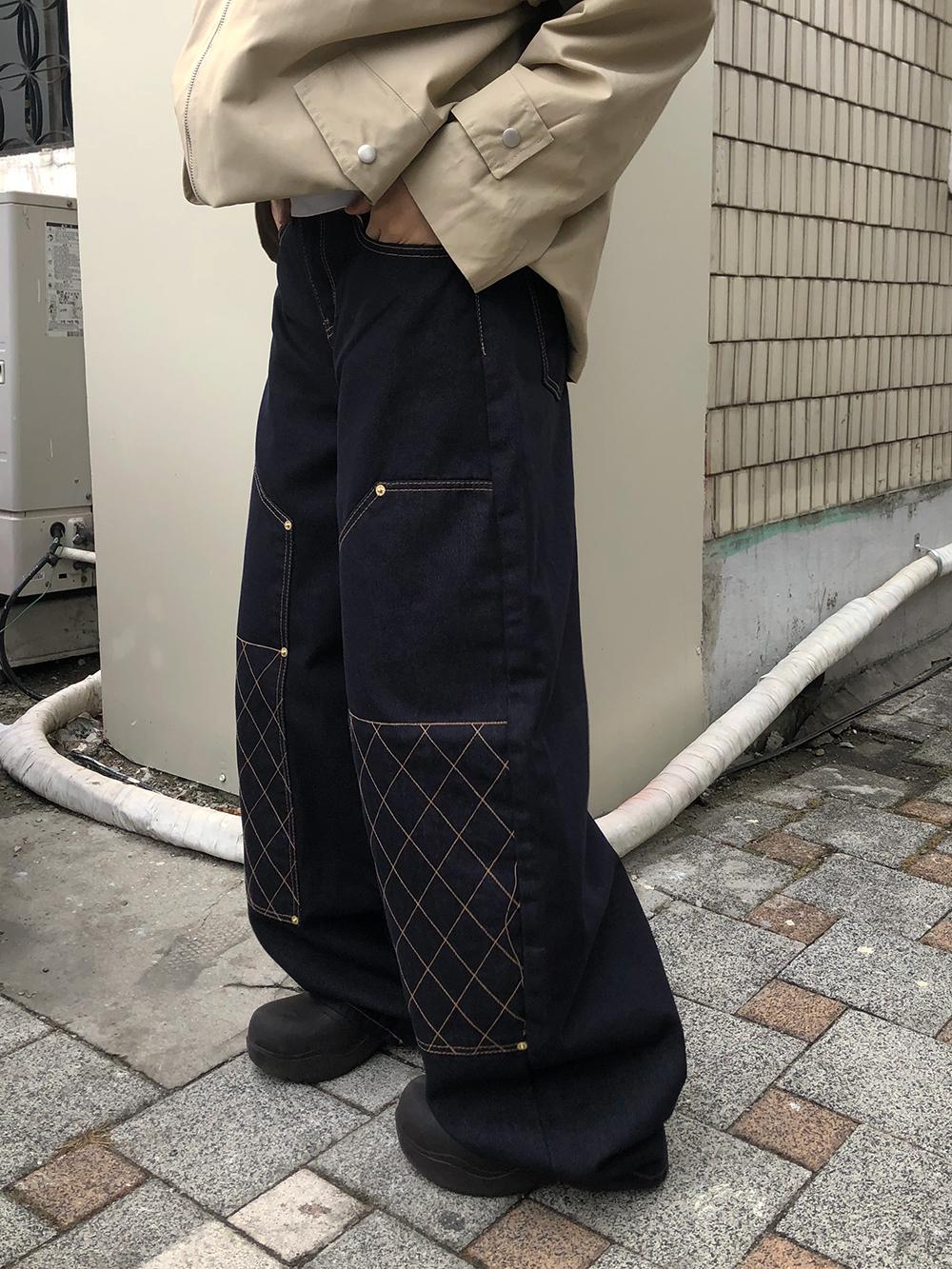 (1 color) 네트 퀼팅 더블니 논페이드 데님 팬츠 Net Quilting Double Knee Non-Fade Denim Pants