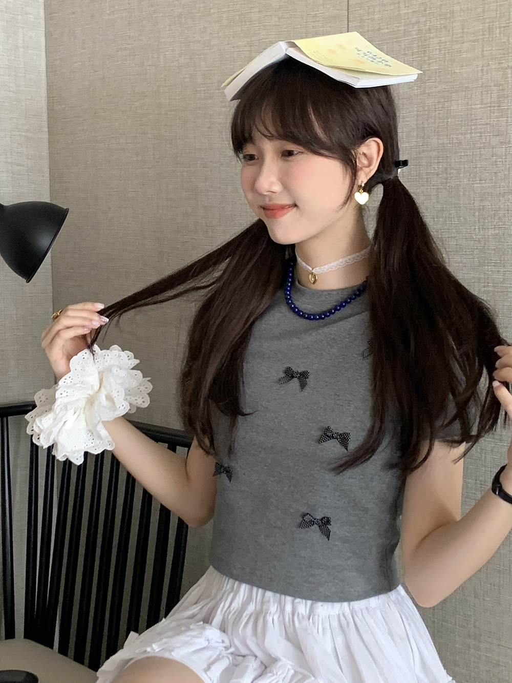 리본 패치 포인트 크롭 반팔 티셔츠