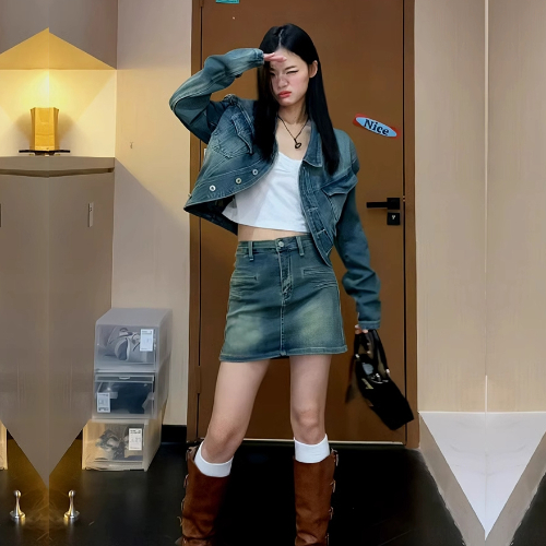 [여름코디/청청패션/투피스세트]데님 청자켓 여름 봄 간절기 긴팔 셔츠 자켓 워싱 데님스커트 숏 A라인 미니스커트 (홍대룩 캐주얼 데이트룩 데일리룩 투피스세트 셋업)