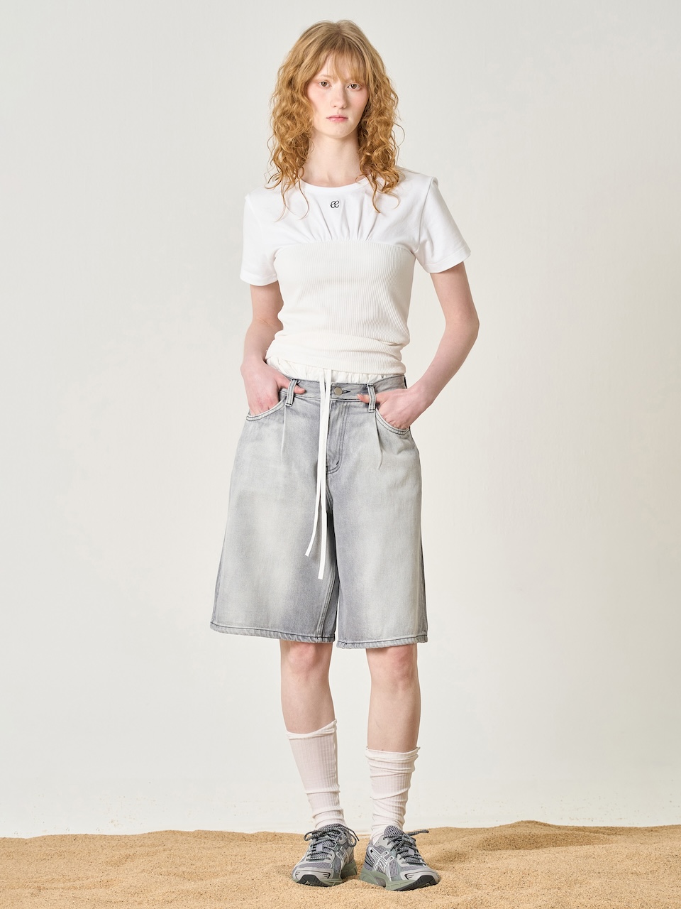 1-Tuck Brush Denim Bermuda Pants_Gray