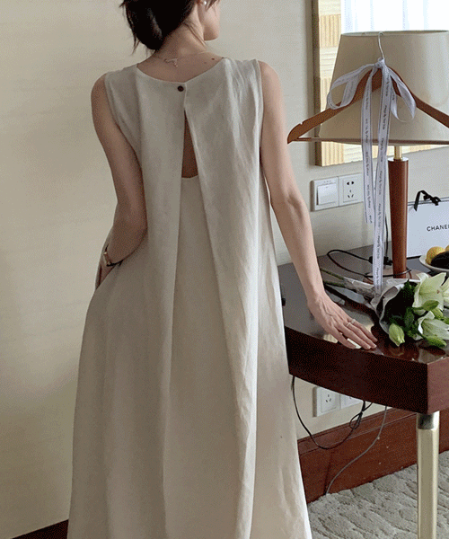 발디 뒷트임 버튼 린넨 원피스 OPS9325 여름 마 라운드 민소매 A라인 뒷단추 백리스
