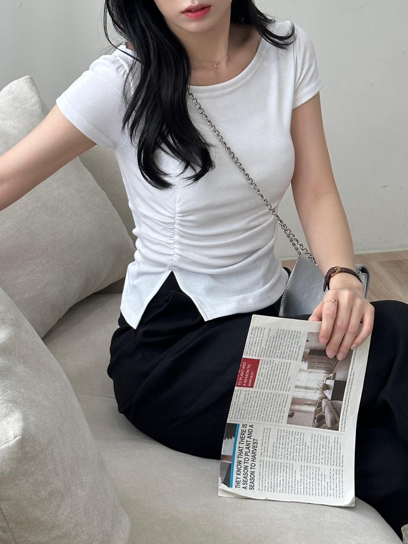 반팔 여리 보트넥 셔링 트임 티셔츠 (4 colors)