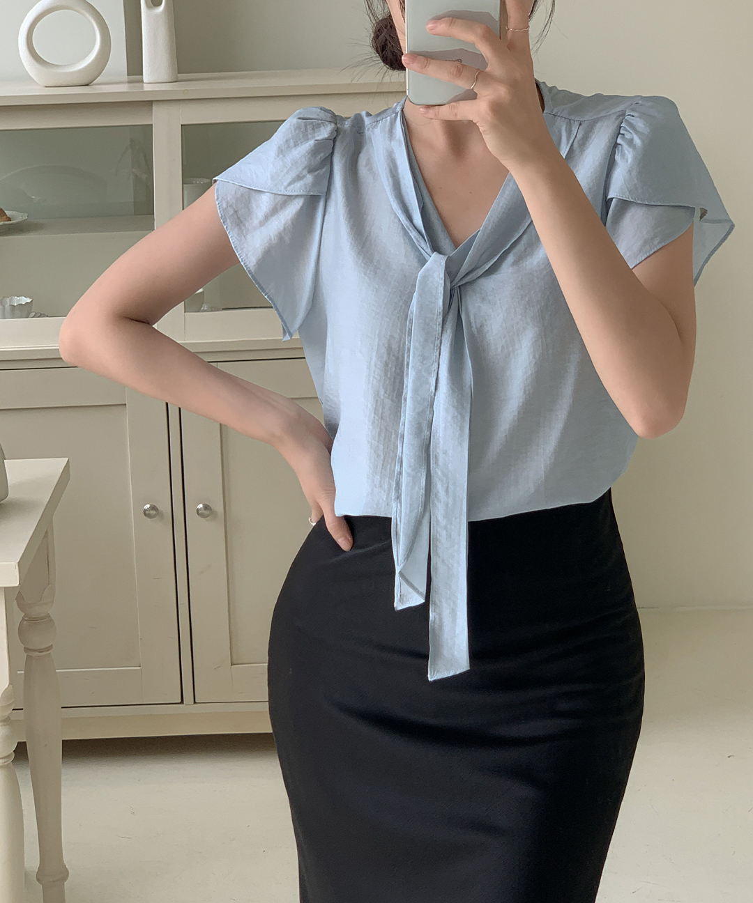 [MADE/뉴컬러추가]로블랑 브이넥 셔링 텐셀 타이 블라우스 (S-XL/1만장돌파/데이트룩/하객룩/타이블라우스/브이넥블라우스/셔링블라우스/오간자블라우스/여름블라우스/튤립소매)
