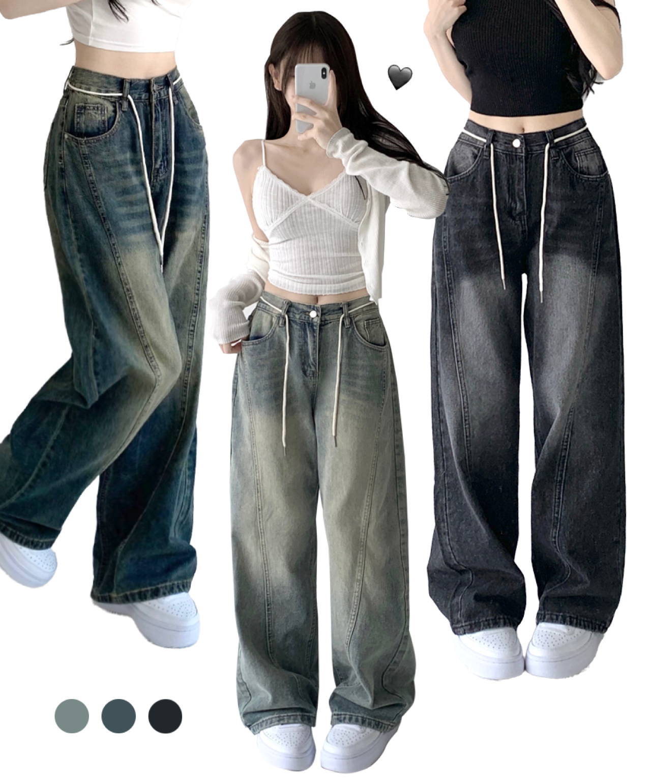 [색감깡패🖤/끈탈부착O] 미드나잇 뒷밴딩 스트링 스트랩 하이웨스트 절개라인 빈티지 워싱 롱 와이드 데님/팬츠/밴딩바지/청바지/사계절청바지/밴딩청바지/여자청바지/와이드팬츠