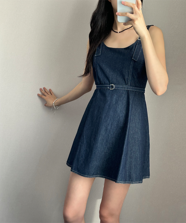 모스트 생지 원피스 캐주얼룩 데님원피스 스티치 벨트 허리끈 플레어 A라인 미니원피스