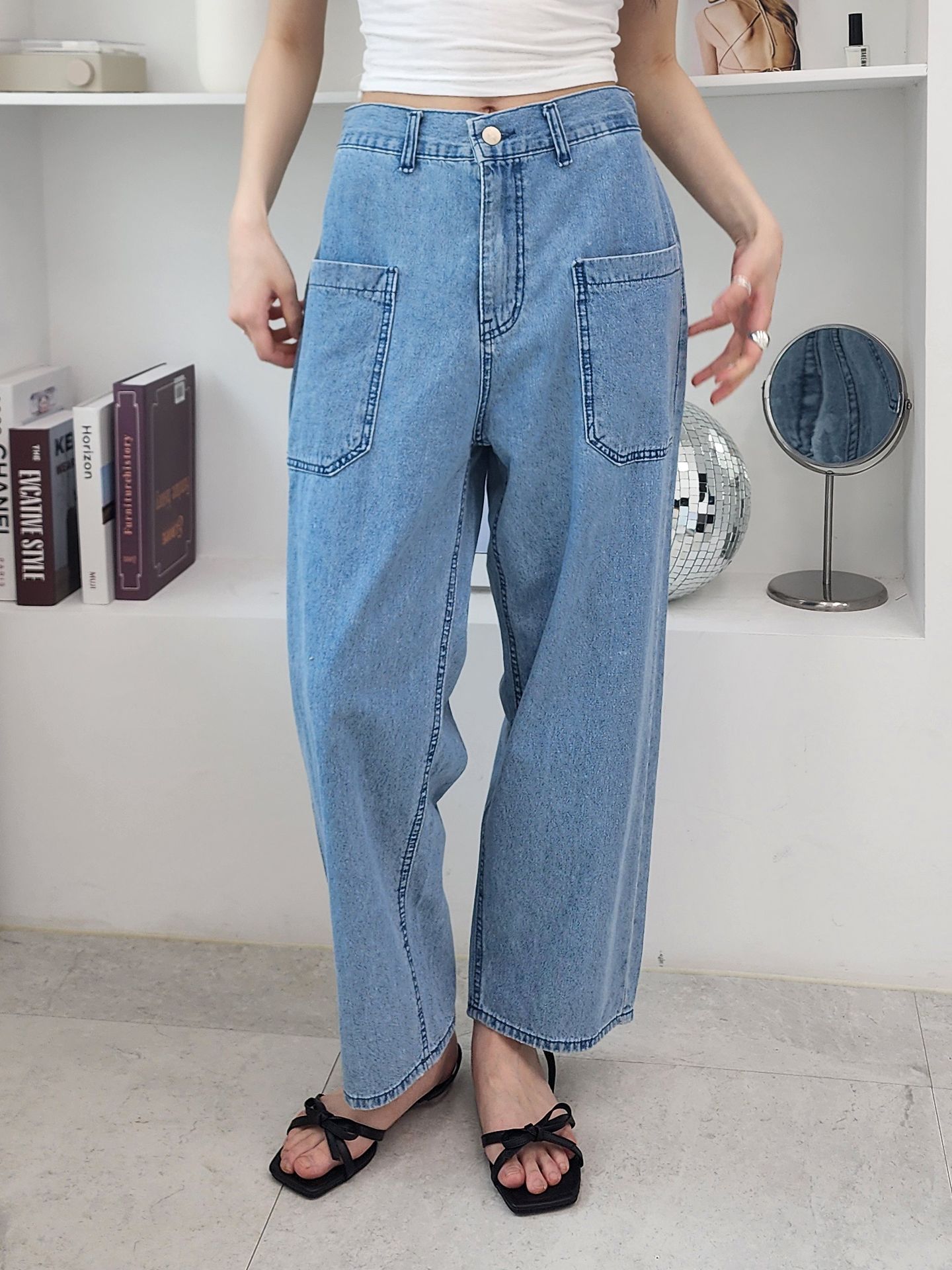 이지온유 데님 팬츠 와이드 청바지 통바지 통 넓은 발목 바지 빅 포켓 큰 주머니 검정 블랙 데님 진청 연청 직사각 허리 고무줄 밴딩 밴드 빅사이즈
