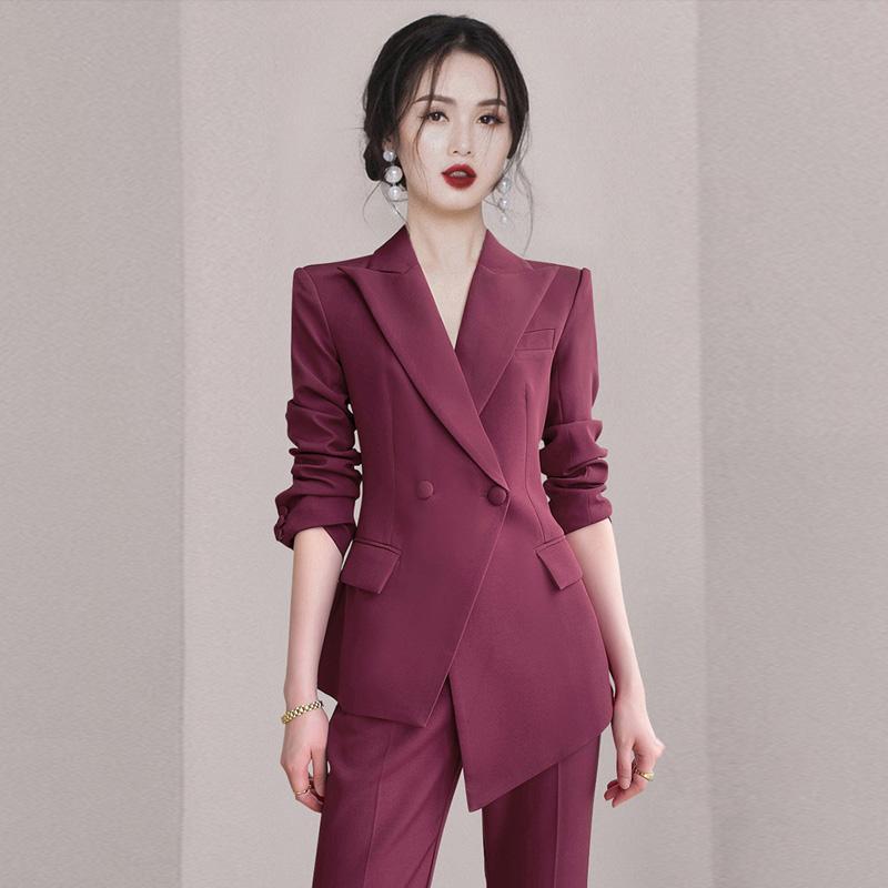 와인 버건디 정장 슬림 격식 자켓 와이드 팬츠 투피스 오피스룩 수트 세트