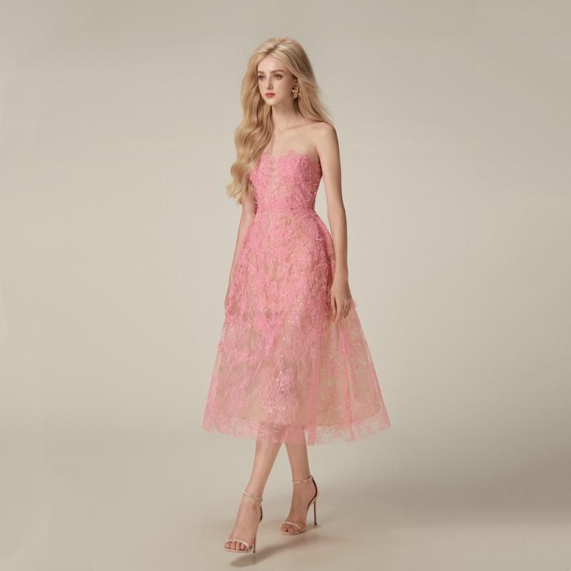 레이스 시스루 여신 핑크 민트 그린 입체 꽃 장식 튜브 탑 웨딩 기념일 파티 드레스