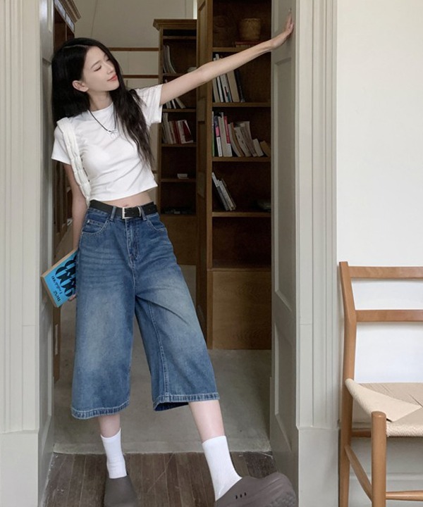 [버뮤다데님] 하이웨스트 여유핏 스트레이트 일자 세미 와이드 워싱 청 반바지 7부 데님 팬츠 90년대 트렌디 스트릿 축제룩 페스티벌룩