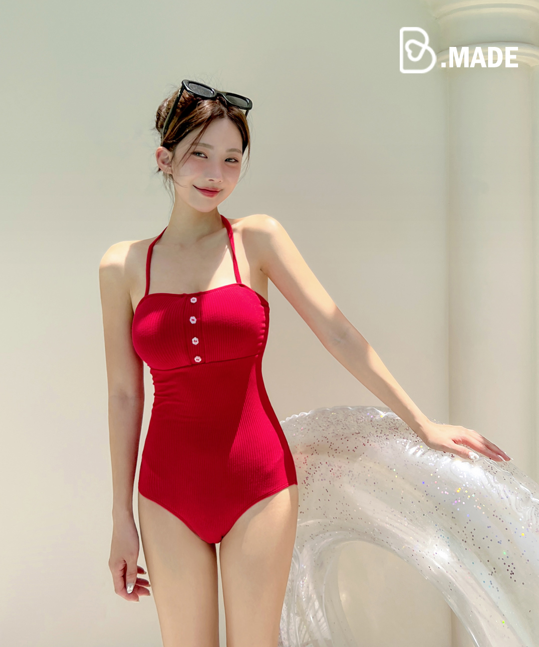 [MADE/M,L] 로즈미 모노키니 레드 홀터넥 백리스 끈 수영복 체형커버수영복