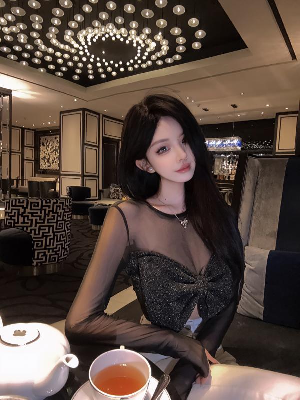 블랙 시스루 메쉬 왕 리본 섹시 클럽 섹시 크롭 블라우스 니트 셔츠 탑