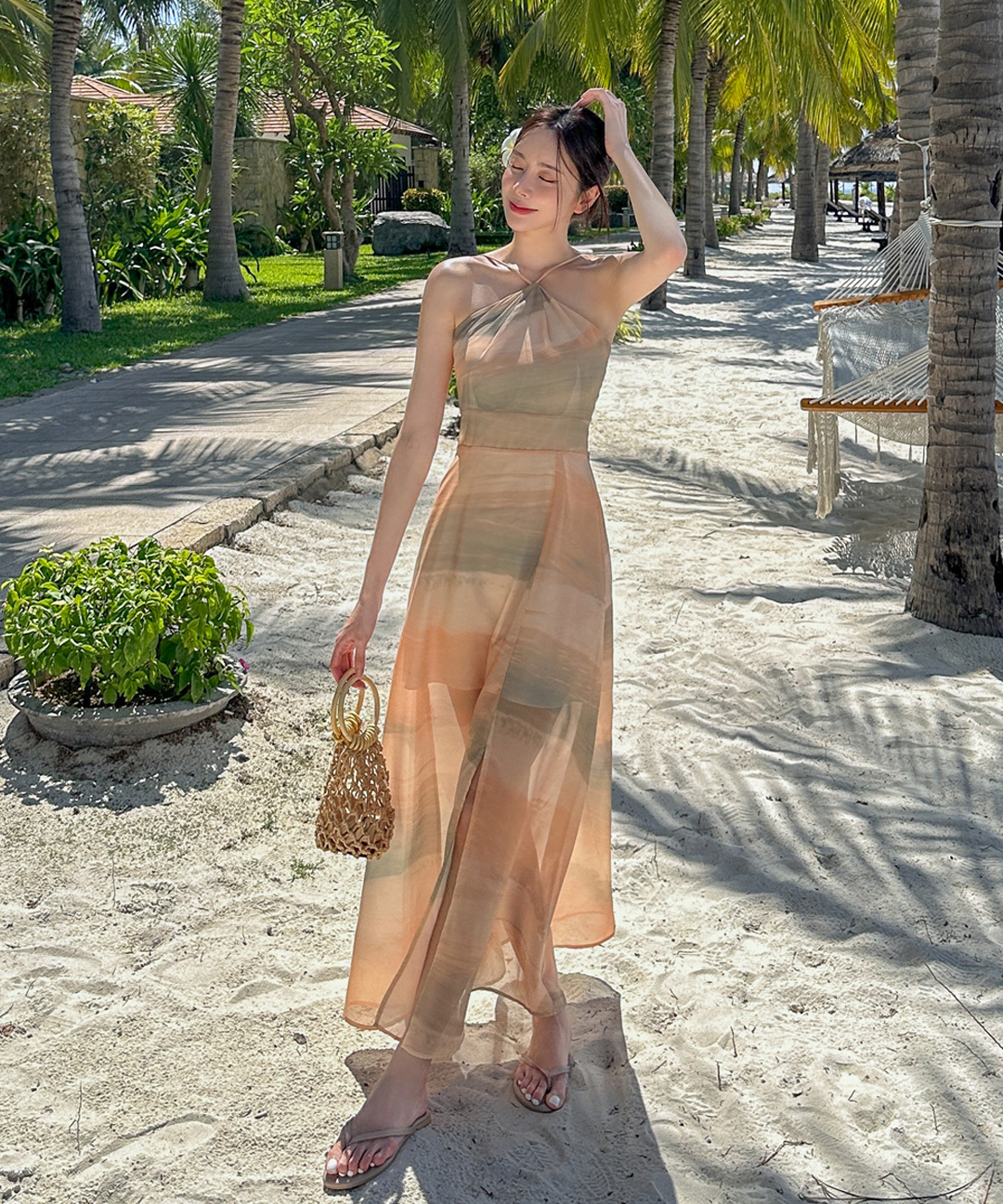 [44~66] 버킨 원피스 물나염 쉬폰 시스루 홀터 비치 롱 맥시 끈 원피스