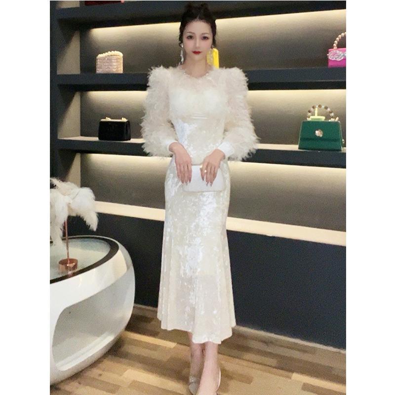 화이트 퍼 벨벳 격식 우아 귀족 웨딩 기념일 파티 연회 드레스