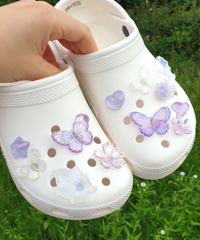 무배[12pcs+키링] 퍼플 요정의 숲 지비츠 세트 set 나비 보라색 연보라 화이트 투명 오로라 홀로그램 펄 반짝이 하트 별 스타 나뭇잎 장미 플라워 꽃 꽃잎 왕나비 큰나비