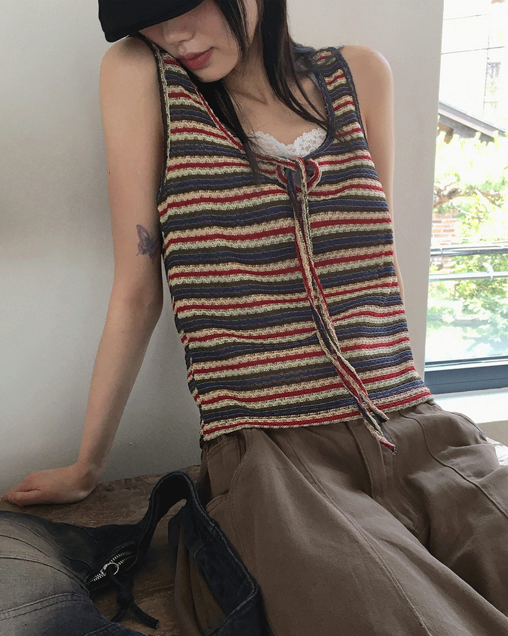 티탄 히피 배색 스트라이프 스트랩 조끼 나시 슬리브리스