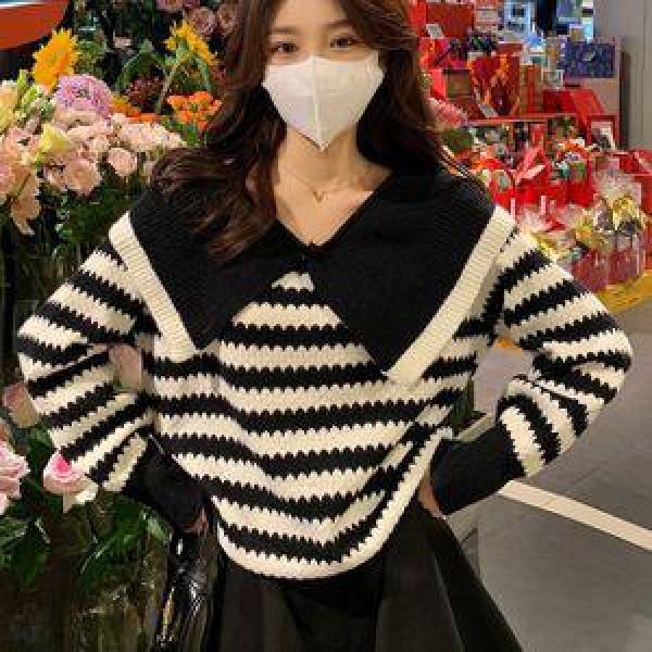 빅 카라 스프라이프 배색 체형 커버 니트