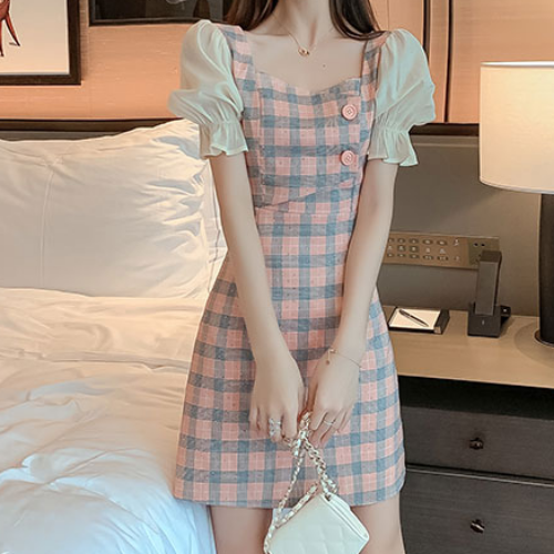 2243(S~XL)홍차스퀘어넥 원피스 소매퍼프 은은한 펄 여름 빅사이즈 원피스 하객룩 데이트룩