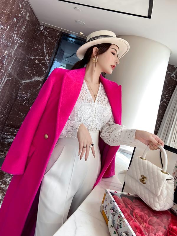 핫 핑크 모직 비비드 벨티드 럭셔리 정장 격식 슬림 롱 코트