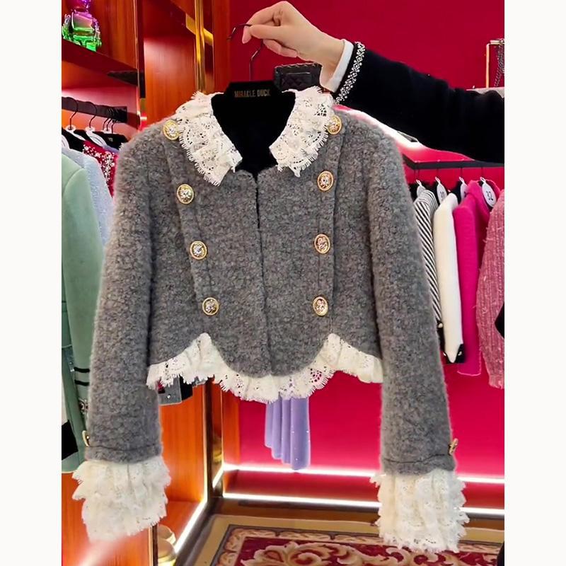 그레이 회색 모직 금장 레이스 스티치 모직 숏 미니 러블리 자켓