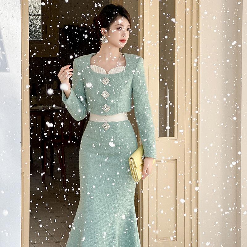 민트 그린 큐빅 보석 다이아몬드 블라우스 탑 피쉬테일 인어 스커트 투피스 세트