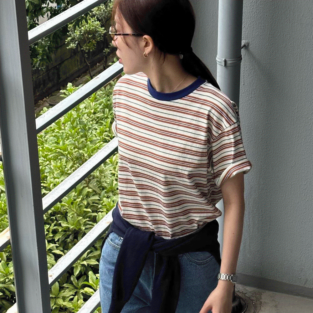 코튼 배색 단가라 반팔 링거티 스트라이프 라운드넥 면 이너 레이어드 티셔츠 프레피룩 데일리룩