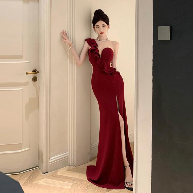 레드 와인 버건디 블랙 프릴 섹시 웨딩 오프 숄더 기념일 파티 공연 이브닝 드레스