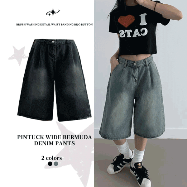 [핀턱/비조버튼] 키토 와이드 핀턱 데님 버뮤다팬츠
